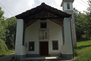 Attraversiamo la strada di collegamento per Santa Elisabetta e con un buon dislivello ci portiamo sopra Pian del Lupo, nelle vicinanze dell’Alpe Piazza, qui lo spartiacque di Pian Mungel segna il punto più alto del nostro tour, un bollino giallo con il n. 3 ci fa deviare sul sentiero che scende nello sterrato del Moschietto, un breve tratto di strada poi il sentiero riprende nel bosco di Pian Ciuleri e sbuca nello sterrato sopra la chiesetta di Santa Croce e l antico borgo di Chiapinetto.